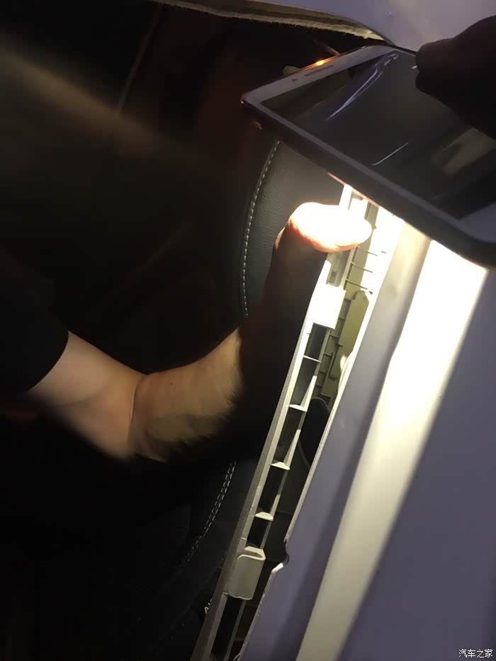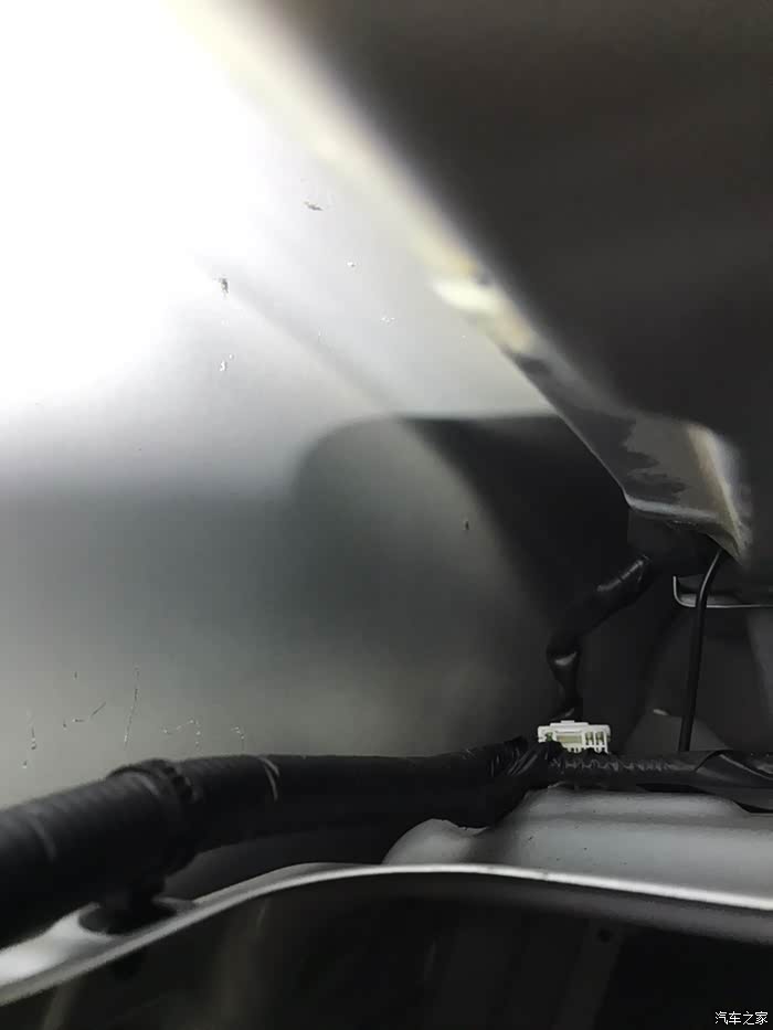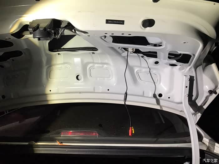一个人忘记拍了,借下之家的图片是蓝色内饰版,密封条拿开,暴力点直接掰内饰版就下来了,缝隙里能看到有线穿过的小洞,就是这步比较麻烦,耐心点就行,第一次线弄反了,测试时倒车影像是好的,没找到穿线时弄反了。
