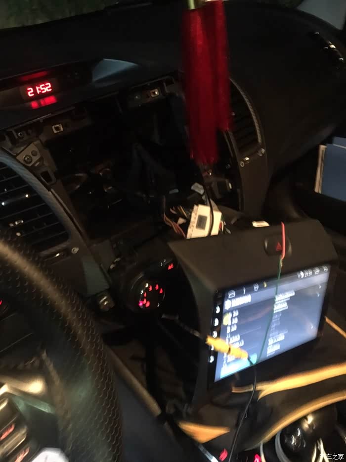 绿色卡扣弄开,红色圈的用点力掰开,黄色的小点地方看到小洞,就是通上图的,最好弄根粗铁丝用来引线,我的原来就装了倒车影像,所以借用了原来的线当引线。