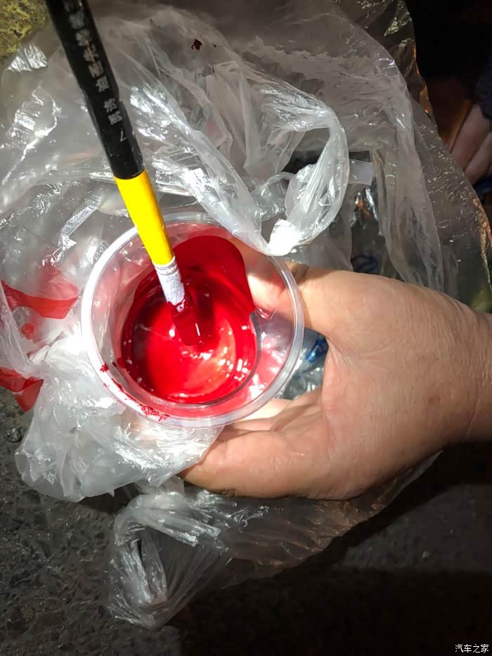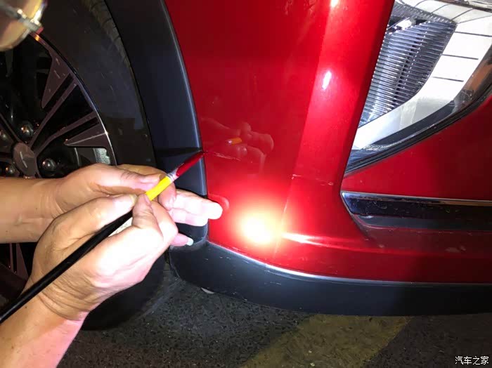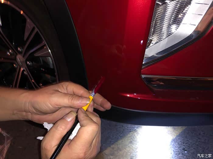找开修车店的朋友要了一点点宝石红色的油漆和小软毛刷,准备自己画一下。