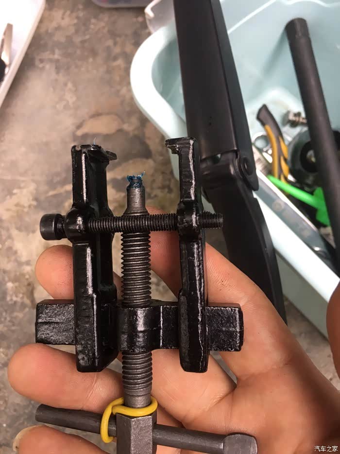 假想断了……心里已经有最坏的打算。找焊机,焊接内六角螺杆。使用尖尾棘轮扳手。拆去。重新更换减震终成。