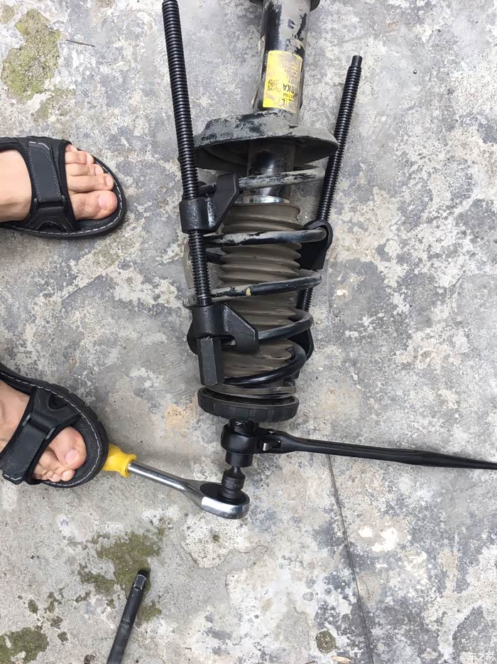 注意:因为是手动,使用棘轮更方便。抓弹簧的点,尽量找上下最大弧度拉,不然你会收了后根本不到位。而且拆完减震顶上螺丝。减震还会往里缩进1.5cm。