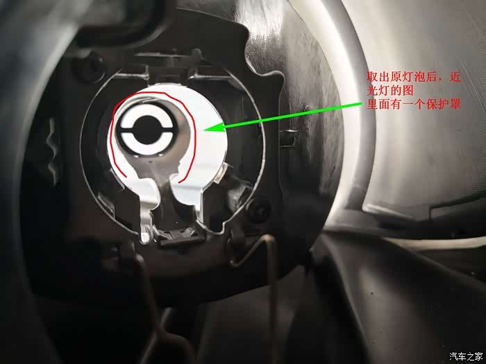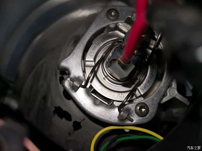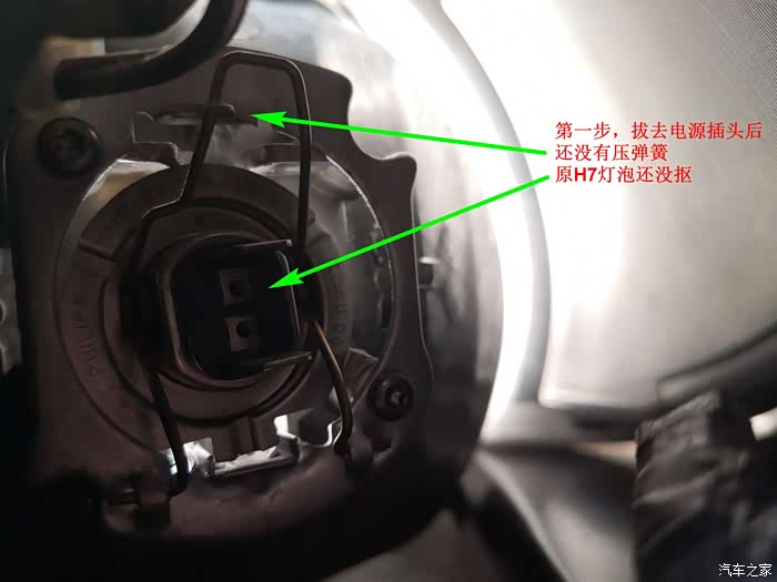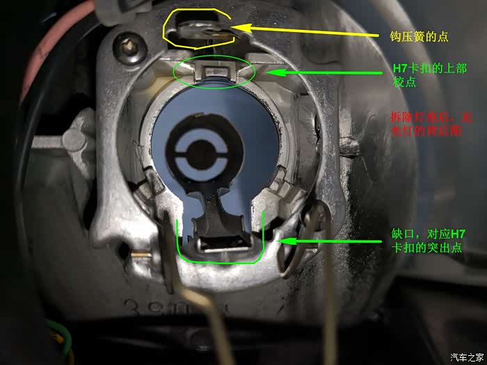 上图是H7卤素灯泡的原图,灯体上那个卡扣有一个突点,这个图突点方向有问题。经过实验,突点最好如上图反向180安装,这样压弹簧很容易了。