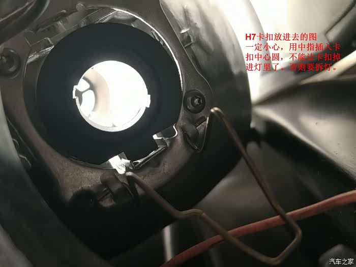 先拆下H7灯的黑色卡扣,安装进灯座。难度系数增大。如果没有信心,就先去妇产医院实习一下安环。我没学习过妇产科,瞎说的。真正妇产科的同学请别砖我 。