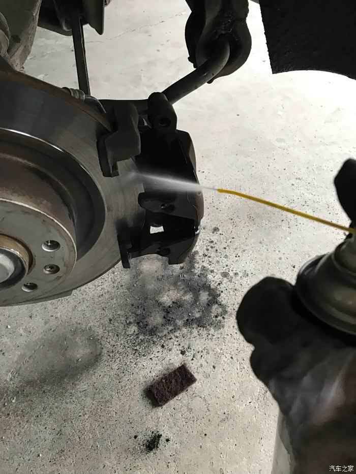 移开刹车卡钳,拆下刹车片,用刹车专用清洗剂往死里得喷,清洗刹车盘和刹车卡钳上的粉尘油污,洗好之后再用毛刷刷一遍,我只能说真的很脏。