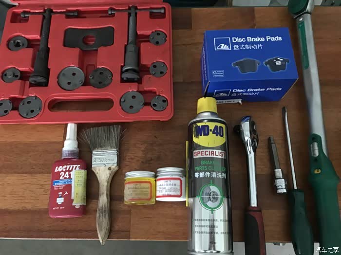刹车片、17mm套筒、7mm内六角、力矩扳手,棘轮扳手、一字螺丝刀、百洁布,棉手套、刹车活塞止推板、螺纹胶、手电筒、刹车导向销润滑脂(黄色),卡钳消音膏(白色),刹车专用清洗剂、毛刷