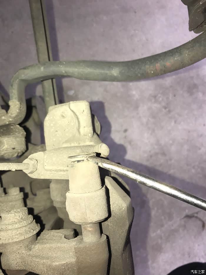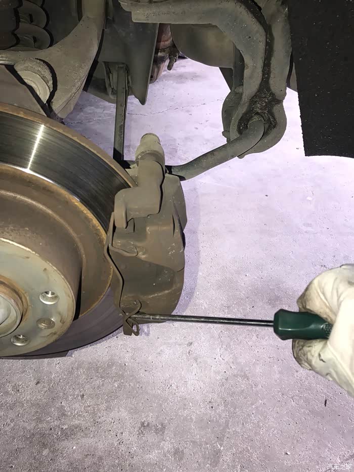 一字扳手撬下卡钳弹簧,这个要是掉了,行驶中刹车就会发出异响。
