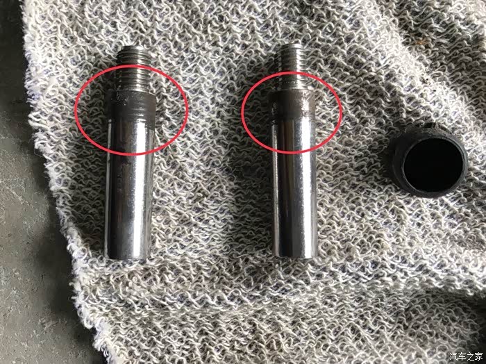 拆下来的导向销,红圈部分已经锈蚀了,必须清理,用百洁布抹上酒精搓