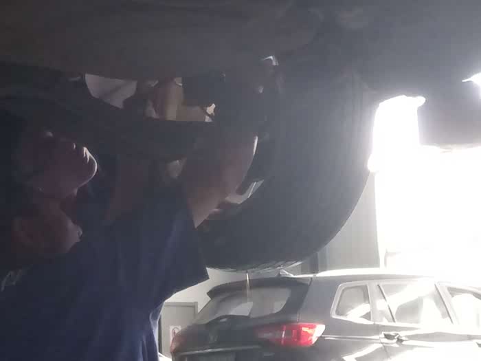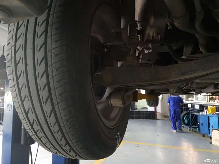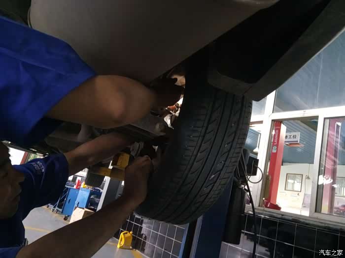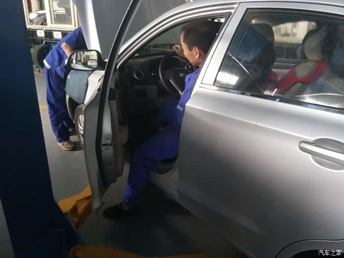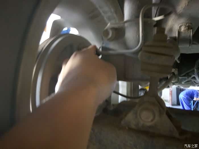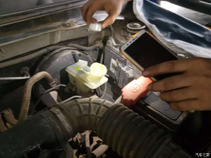另外一个师傅在不间断踩刹车,好让新进的刹车油流到各个轮胎刹车线当中去