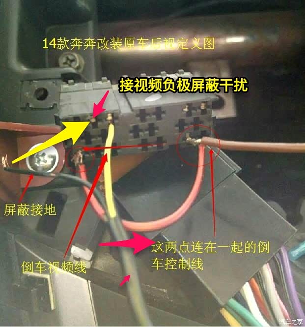 这图是我三年前本打算换安卓导航,用万用表摸索出来的接线法。现在改动16号线要接在图示屏蔽接地的视频负极上,而不是接地负极。