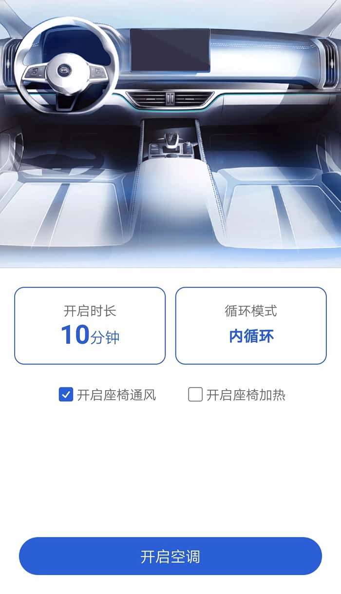 云服务APP开启空调的界面,在杭州的夏季非常实用,还可以同时开启座椅通风。