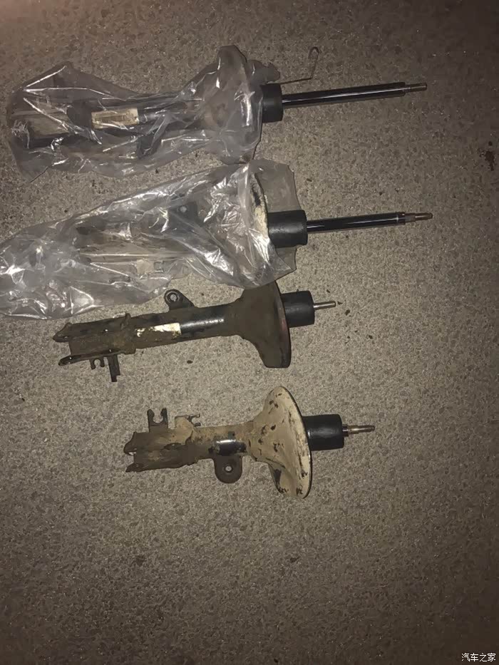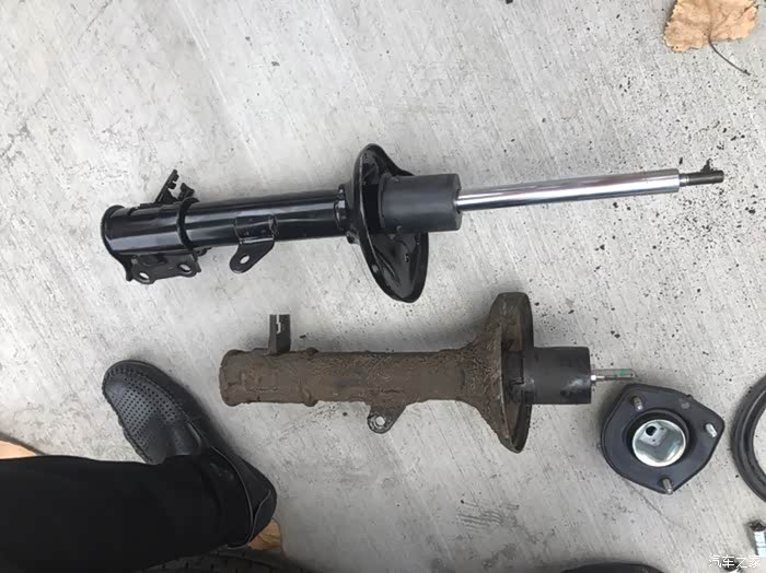 新旧减震合影,旧的减震器一点作用不起,拉出来减震柱芯在重力作用下直接回落到底部