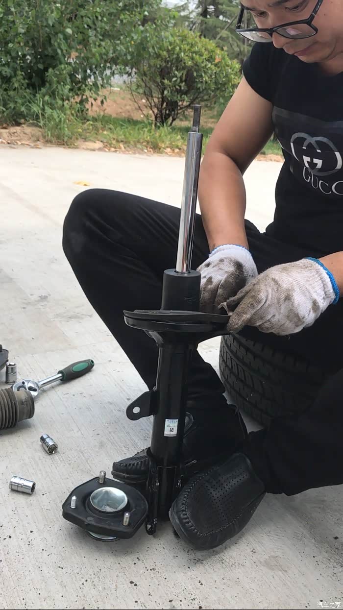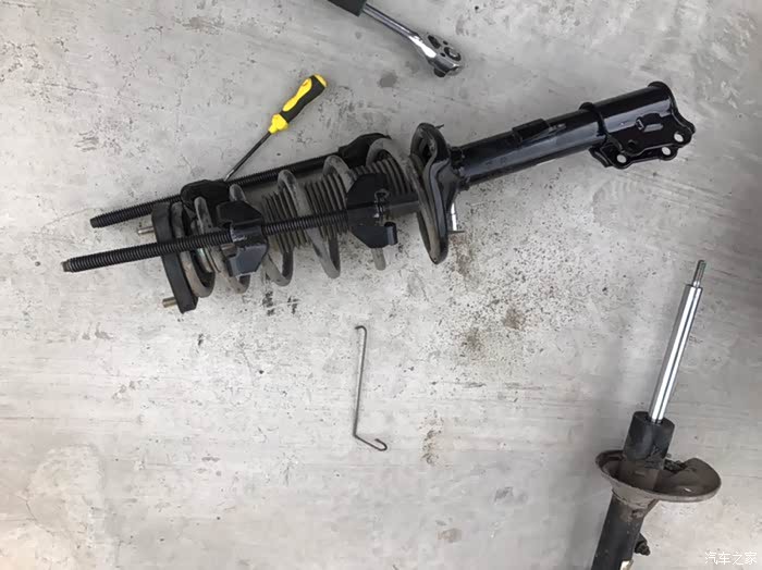 减震压缩,这里就是压缩的减震顶盖,只压缩弹簧的话,还有剩余弹力,如下顶胶和螺丝后安装新的减震就成了问题。