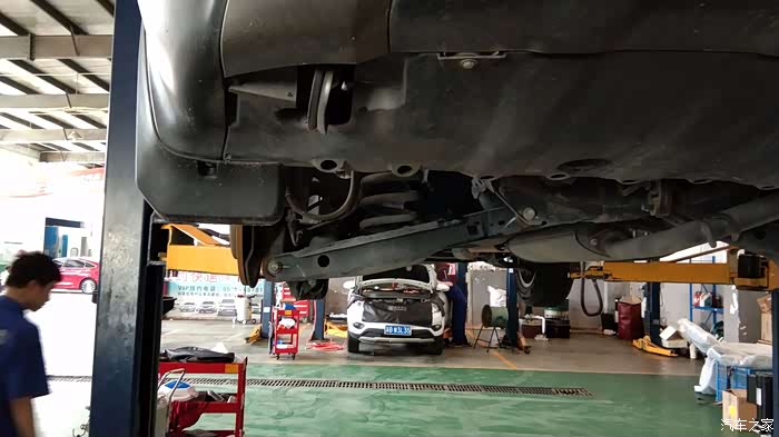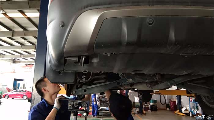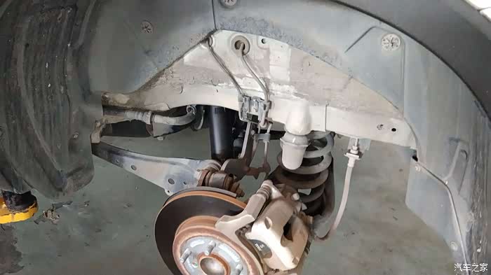 维修师傅用支撑托起后面的横梁,一会儿工夫老的减震就拆下来了。