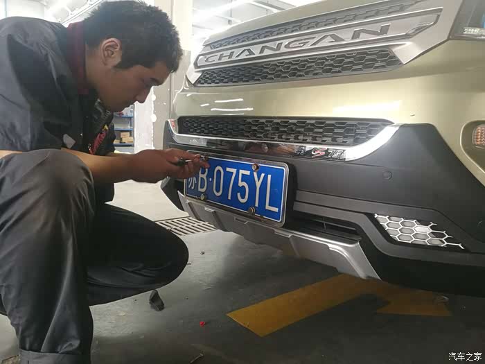 车牌固定在前护杠上,小师傅工作非常认真仔细