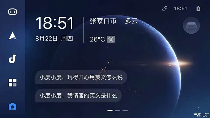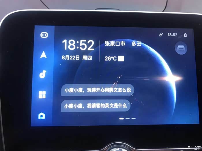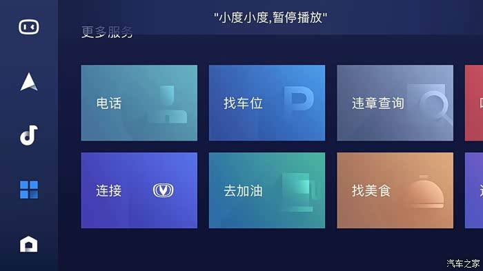 这时,你的手机界面就会变成这个样子。第一个是语音控制功能。可以使用导航,搜索音乐。有点像长安汽车自己研发的语音控制系统“小安”