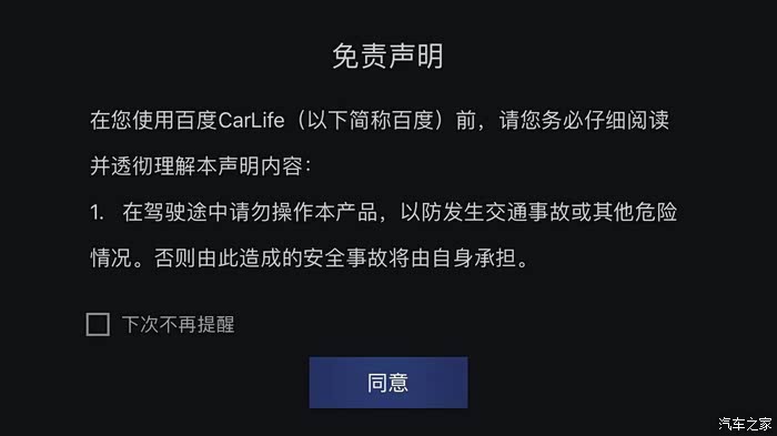 百度CarLife也是用免责条款,别管它,点“??”,同意,进行下一步吧。