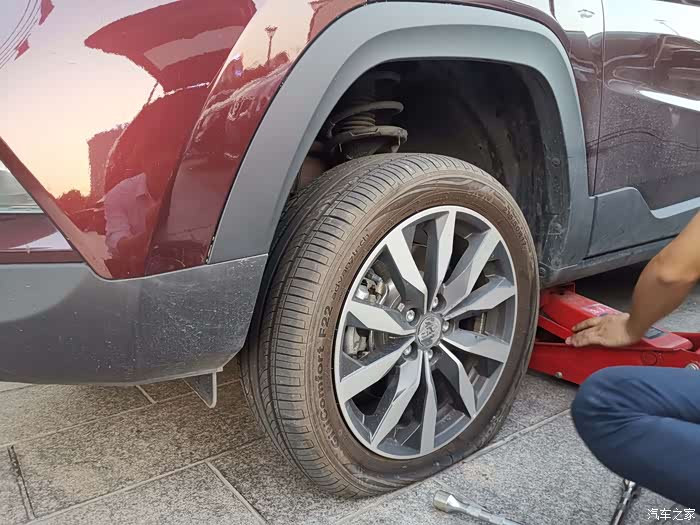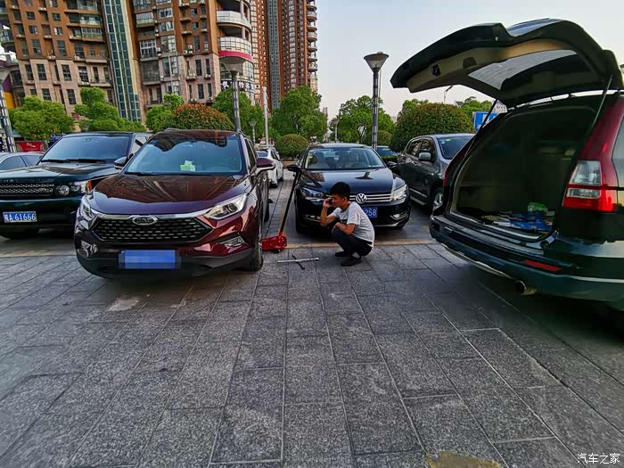 前几天朋友过来,我开车去酒店接朋友,接到朋友,准备出停车场来了一个电话,就顺手接了,然后就一边听电话一边出停车场,一不小心感觉轮胎蹭了一个东西,当时心里就感觉不妙,果不其然,大概10秒钟以后,我开了20米的距离,胎压监测开始报警,胎压显示0Kpa,接着就听到轮胎皮压在地面的噗噗声音,这次看来伤的不轻,胎压直接到了0kpa,
