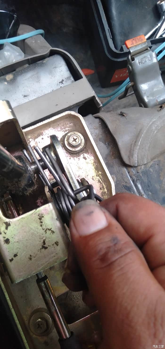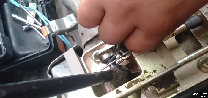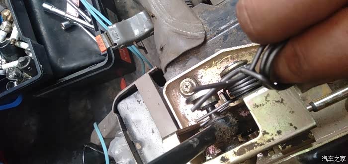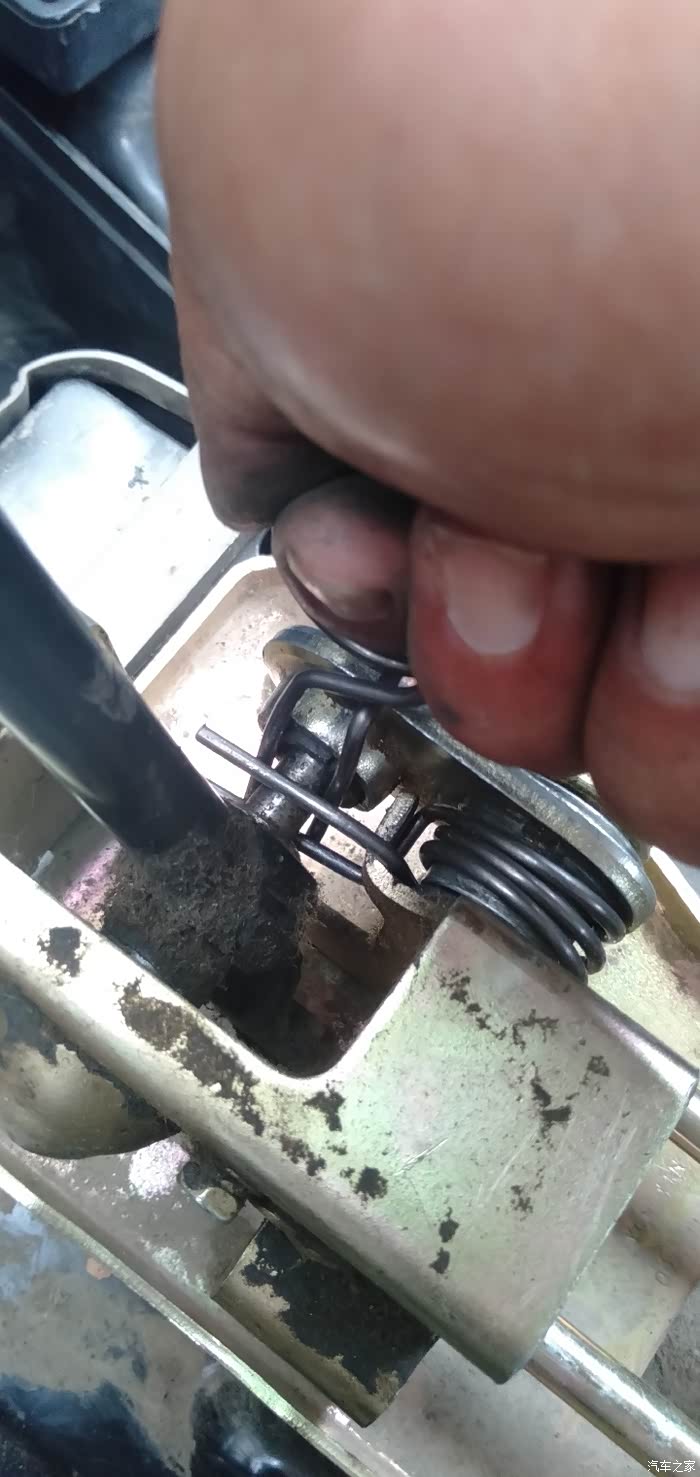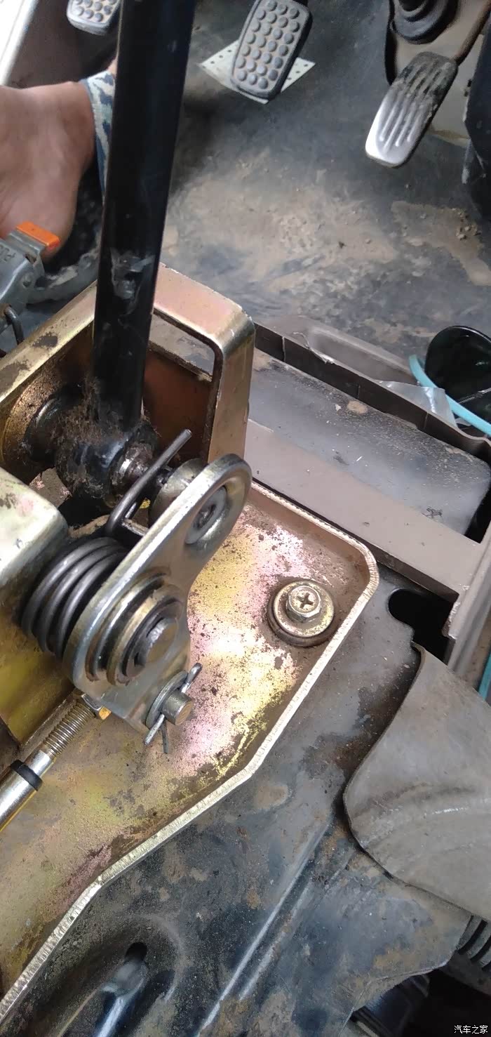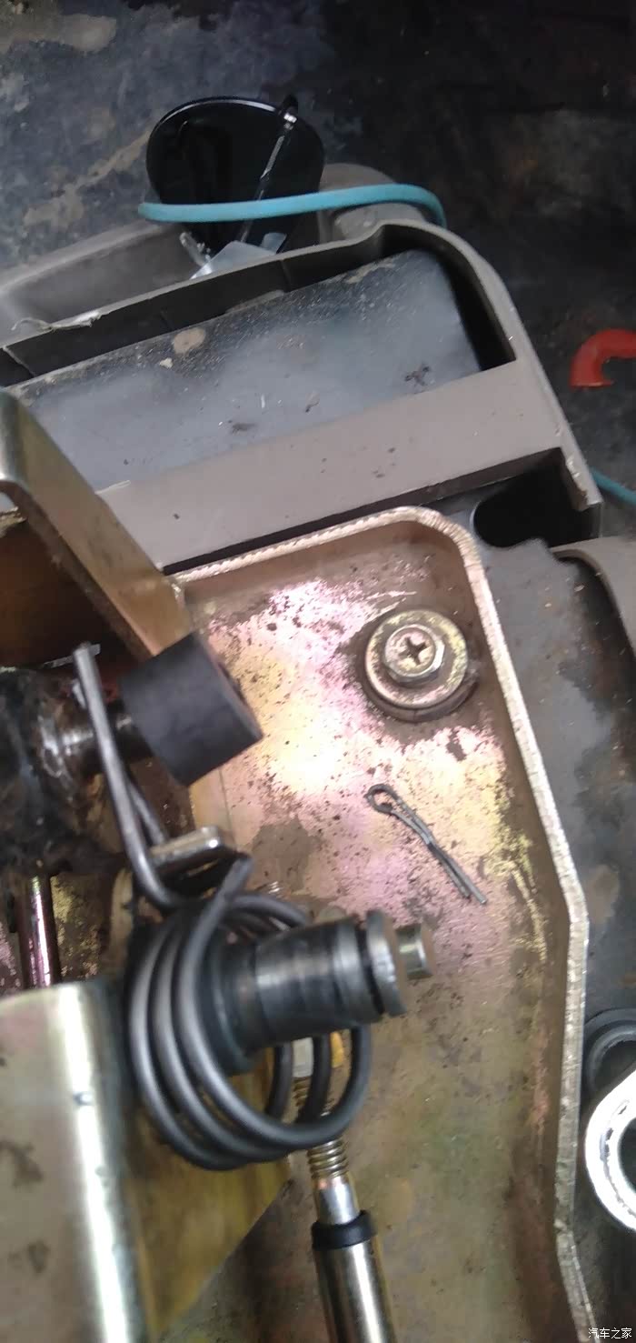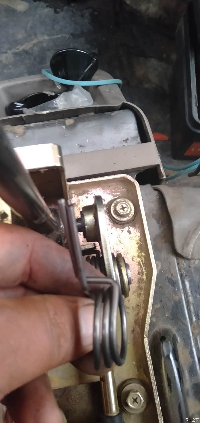 车子是二手的,买来排挡杆回位弹簧就断了,去年在网上买了一套不配套,主要是弹簧孔径小了,又把断的用钳子折了下凑合着用到现在,这一段时间没事就在网上又买了两个,这次刚好买了两个不到十一块钱,一个备用,现在直接进入主题,首先把排挡杆壳拆下来,前面两个自攻丝两边两个六个的螺丝都是用十字螺丝刀拧下来