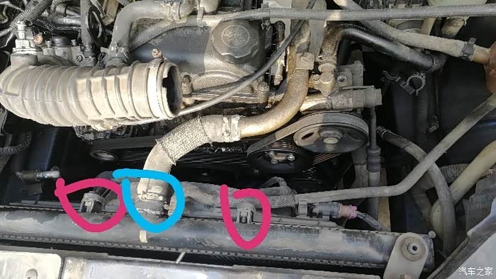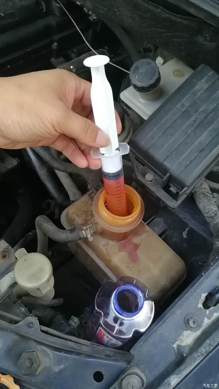 因为要把水箱风扇取出来,才好操作拆皮带轮和曲轴前油封。拿出来的话,要把水箱上水管拆掉,避免防冻液漏得不够用,先从水壶里抽出来些备用。