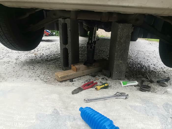 车上带的千斤顶,垫两块砖头,最好红砖,我的碎就一块,这回用两块
