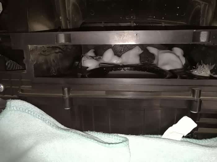 打开副驾驶的储物箱,并取出物品...取下储物盒,把毛巾铺在上面!方便擦拭清洗剂的泡沫...