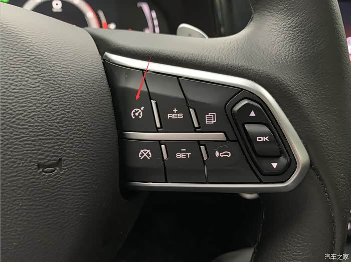 这是巡航功能按键,跑高速时按一下,然后可以按左边的加减按键加速和减速,非常实用! 而且小七配备的是自适应巡航功能,右下角键可设置跟车距离,可自动加减速,十分方便! 另外提醒一句,虽然不需要踩油门刹车,但是我建议还是把脚放刹车上,以防万一,万一有车突然从你边上插过来呢?