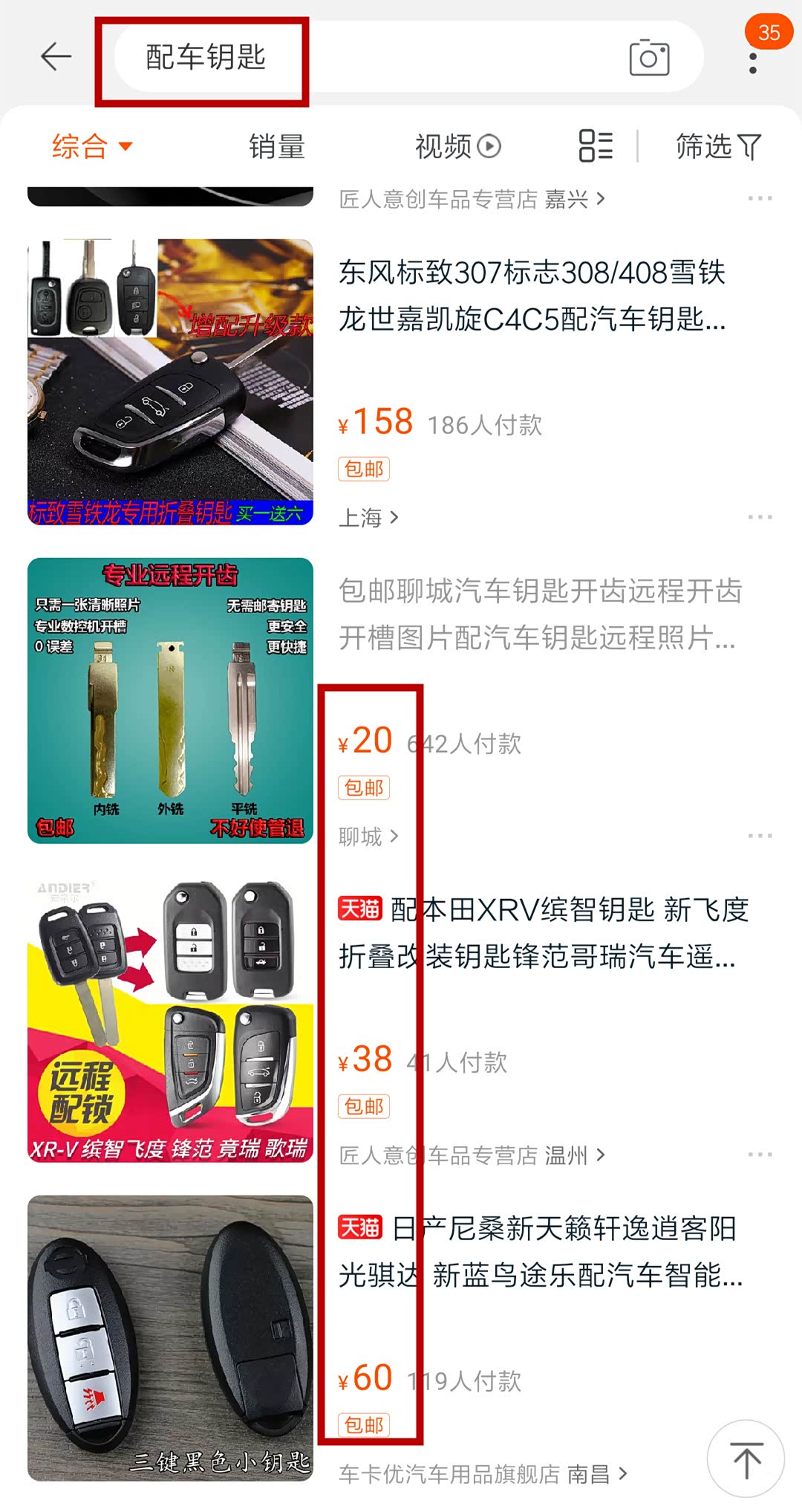 当老司机看到这个话题以后,开始是不信的。后来我自己打开了某宝,搜索“车钥匙”关键词,发现如今网络上只需图片就能配钥匙这种服务非常普遍。
