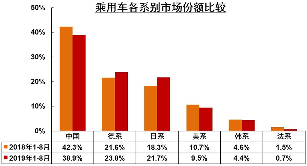 根据中汽协的数据显示,在乘用车领域,前8个月,自主品牌乘用车共销售517.8万辆,同比下降19.5%,占乘用车销售总量的38.9%,比上年同期的市场份额下降3.4%,继续走低,市场份额也跌破40%。韩系、美系、法系汽车市场份额均出现同比下滑,相反,德系和日系的市场份额则出现逆势增长。