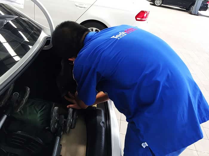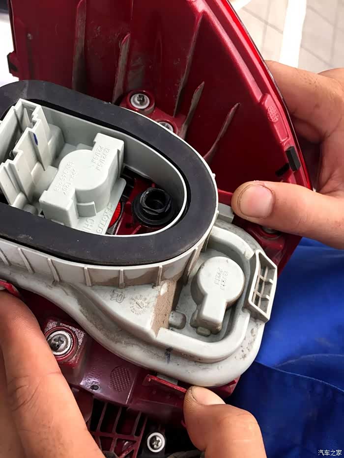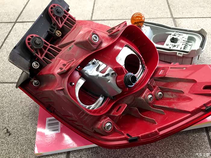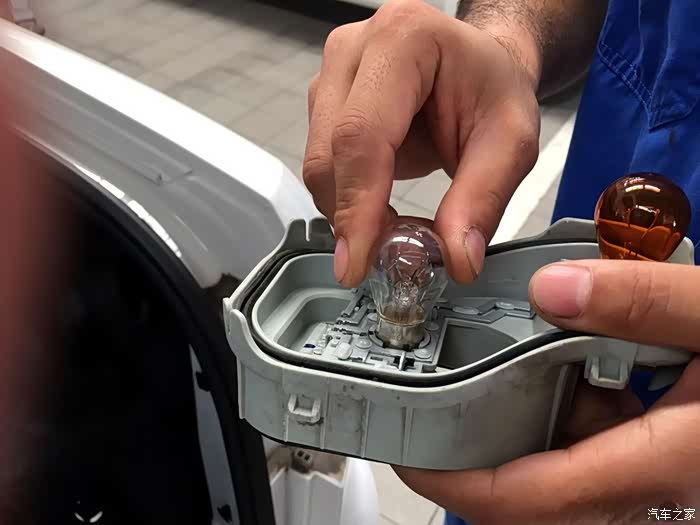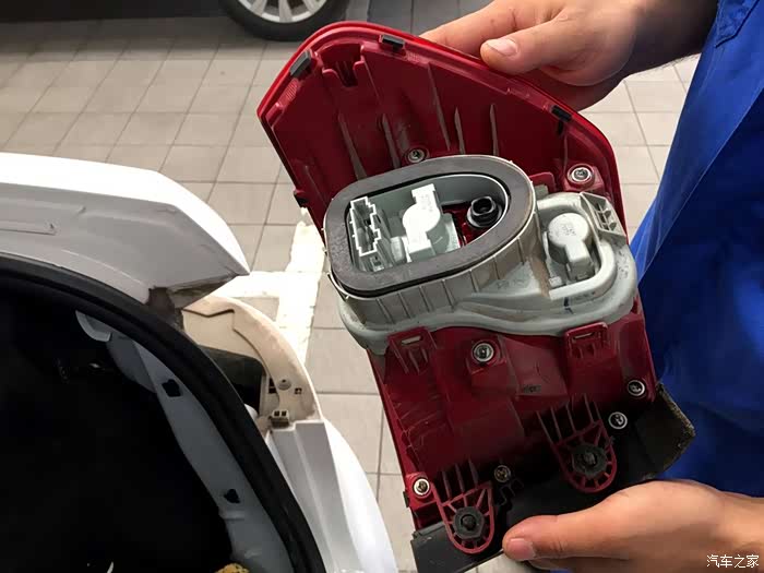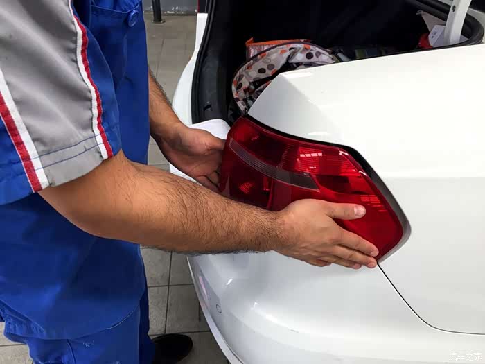 维修师傅接车,检查刹车灯不亮。灯泡不亮,首先要检查灯泡,因为灯泡原因占大多数。动手拆灯。