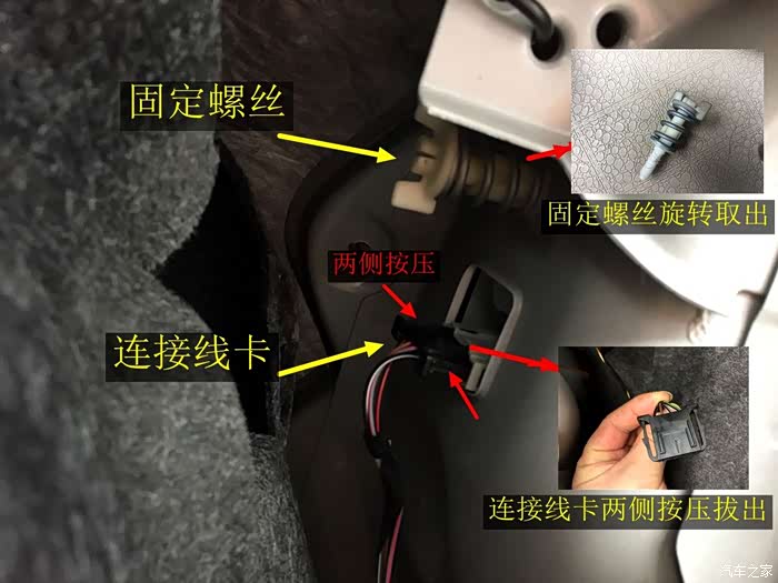 固定螺丝旋转取出,连接线卡两侧按压拔出。