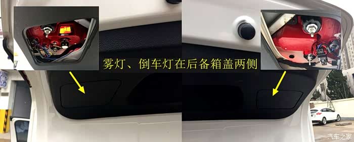 关于“后雾灯”只有一个问题,我之前专门打开进行过查看,后雾灯安装在后备箱盖两侧,打开后备箱盖,撬开盖板,可以看到左、右侧灯区。