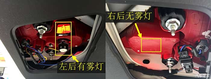 对比左右侧灯区,可以发现,左侧安装有雾灯,右侧没有安装雾灯。