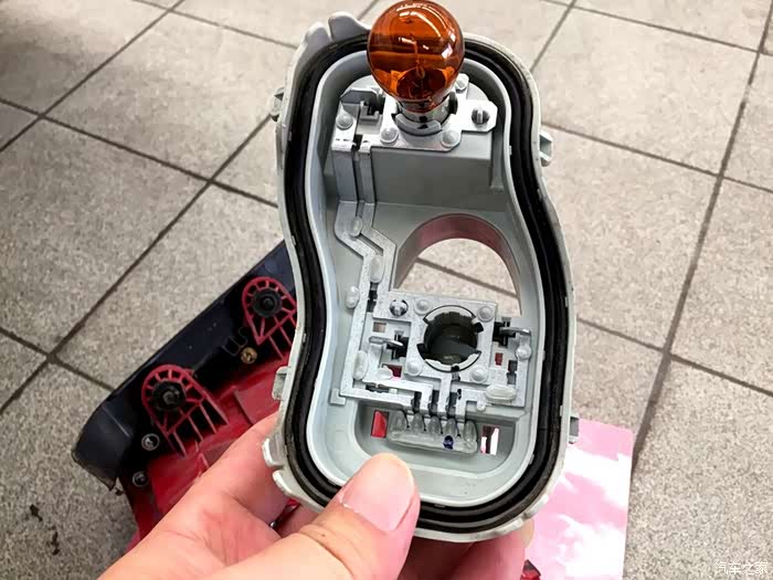 灯座上有2个灯泡,白色的是刹车灯泡、咖啡色的是转向灯泡。