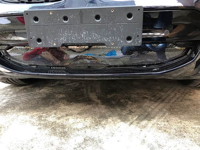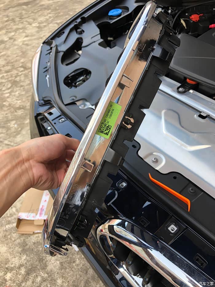然后就开始安装,先装下片,下片装外面,手要往中网里面伸进去,没什么技术难度,下片不用扭螺丝,直接是铁片掰弯固定在里面。