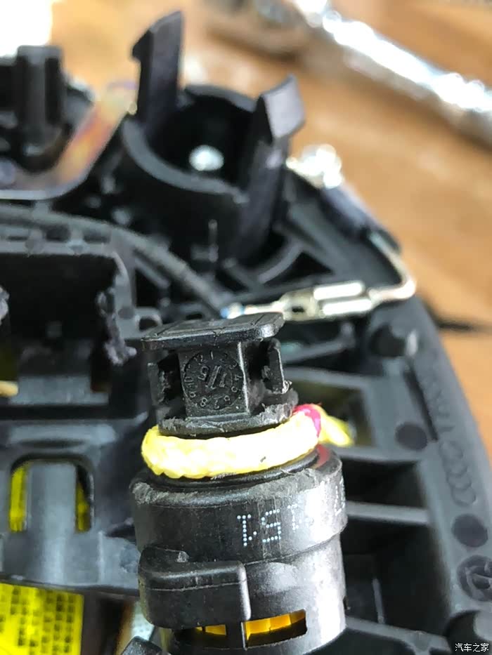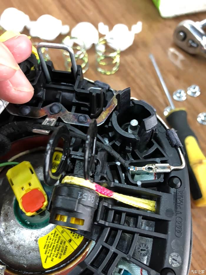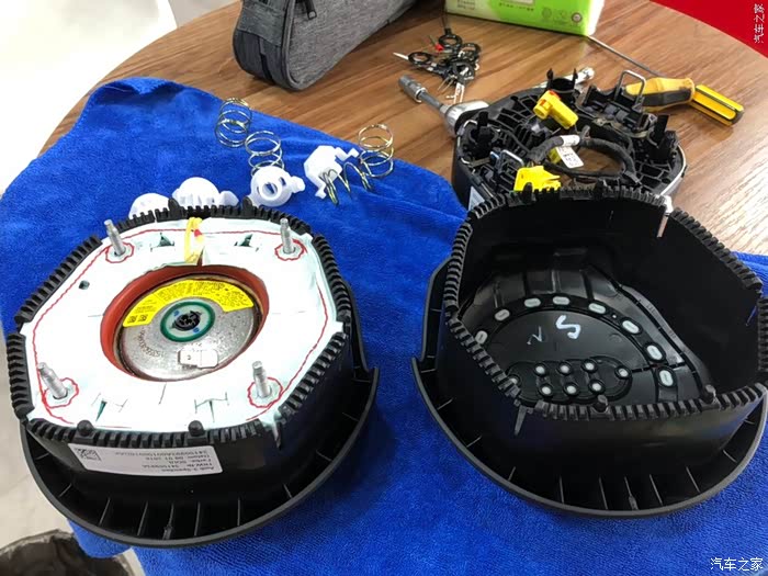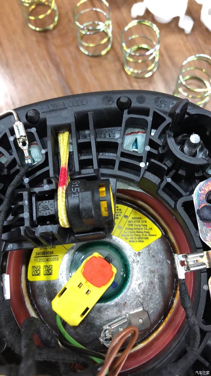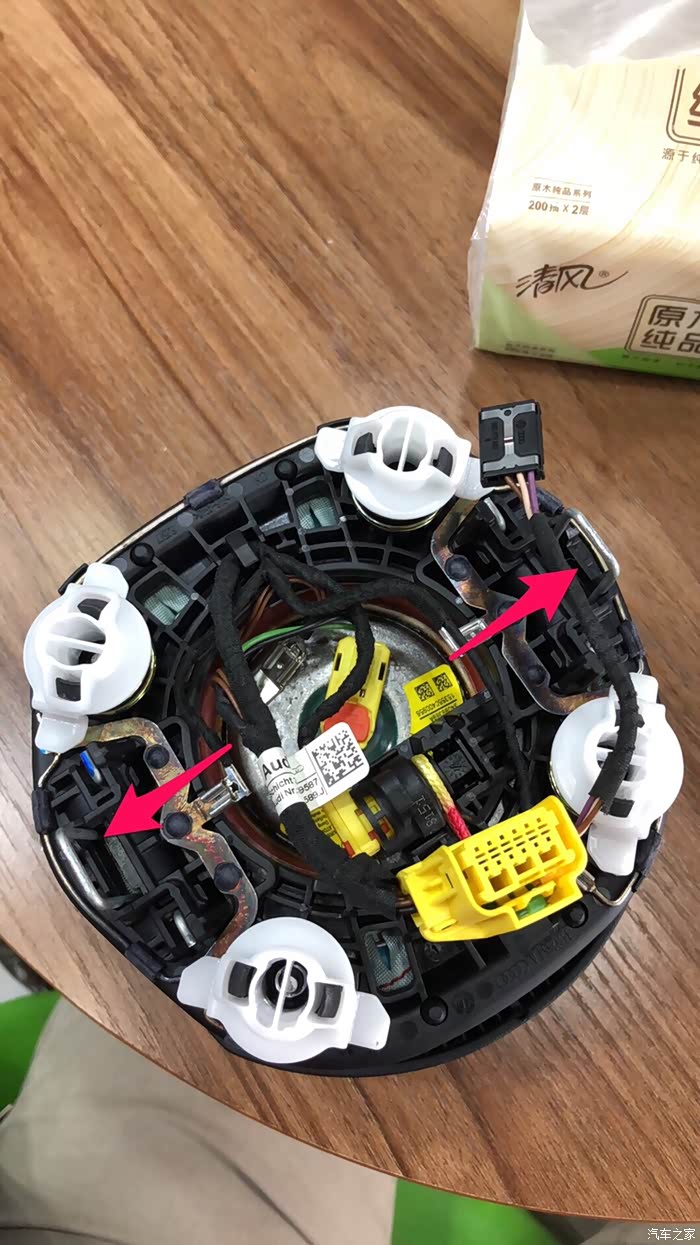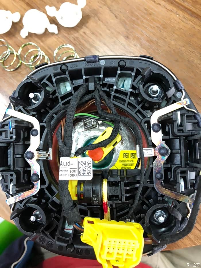 拆下后完整样子。左右剪头指的的竖着的卡簧就是固定在方向盘上的机构。