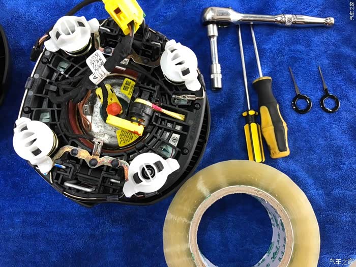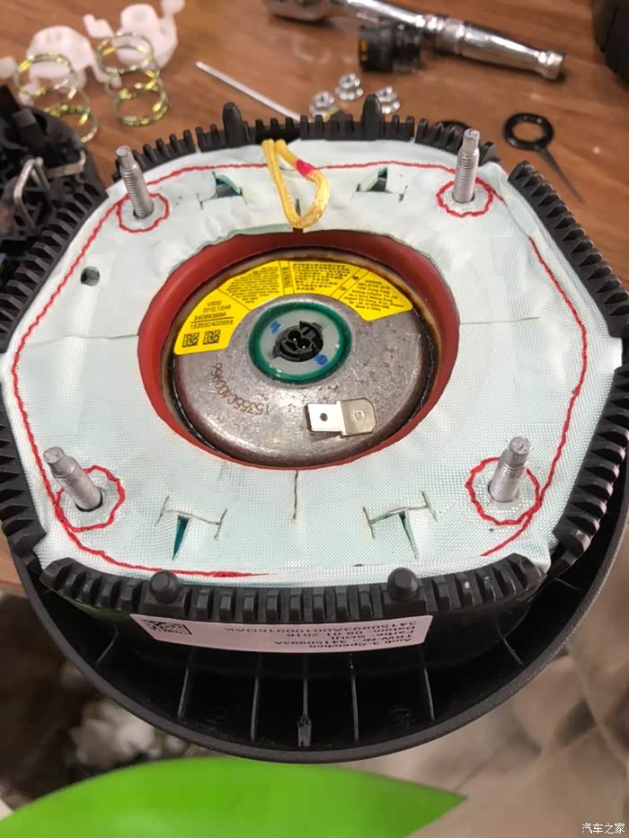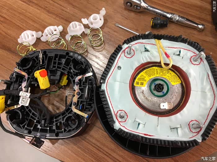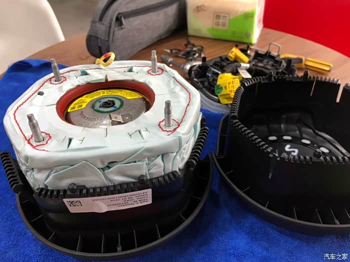 气囊拆除 左右各90度,气囊下方用一字敲一下,同时上面扣出来。期间需要点火2次用于转动方向盘,其他任何时候关闭电源。2次操作后气囊可分离方向盘。注意:1、拔出气囊连接线在方向盘上时,要完全关闭车辆电源。安装时也同样。