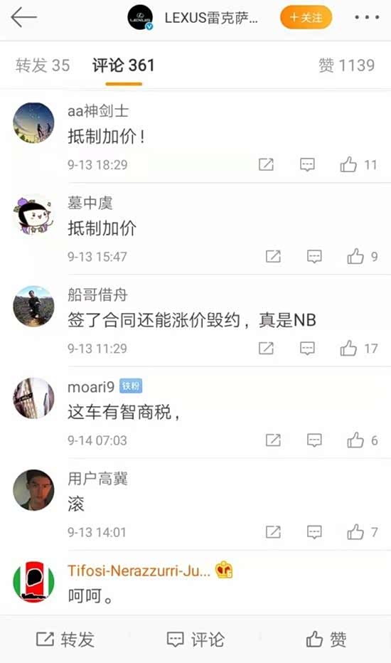 中秋期间,很多车企都对旗下车辆进行了大减价,但是其中雷克萨斯不但没有进行降价,反而进行了涨价。对面雷克萨斯给消费者这样的“中秋大礼”,消费者当然是骂声一片。甚至有些刚交完定金的车主认为雷克萨斯单方面违约,已经开始进行维权。