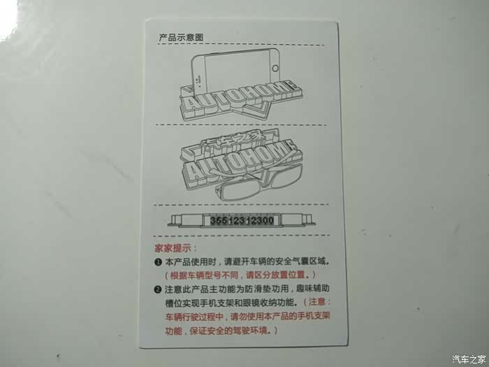 合格证背面就是产品的介绍说明,具备防滑,放眼镜以及挪车牌的功能。