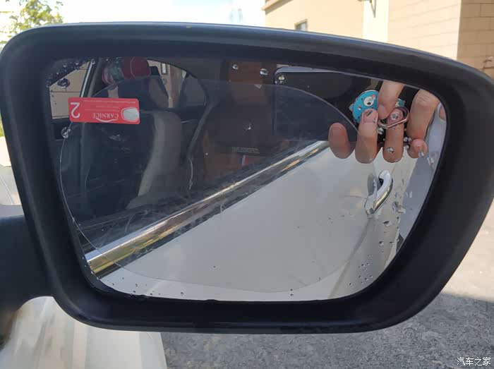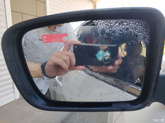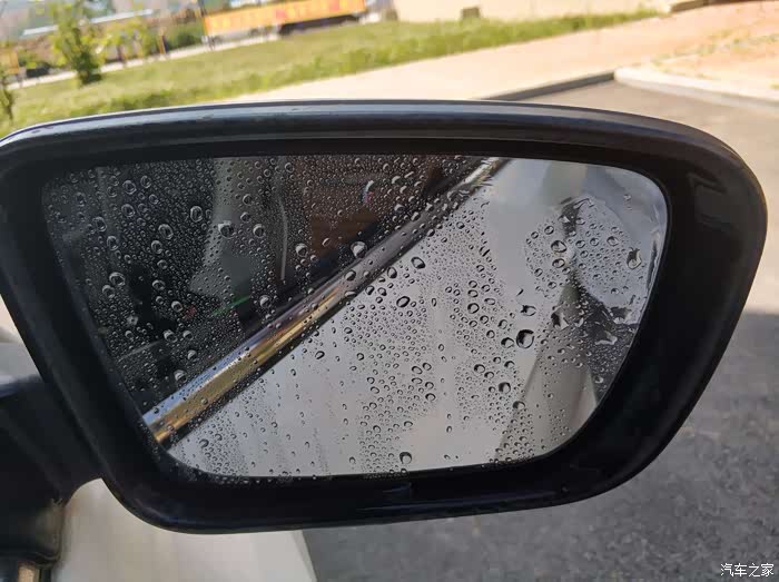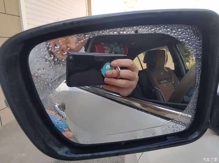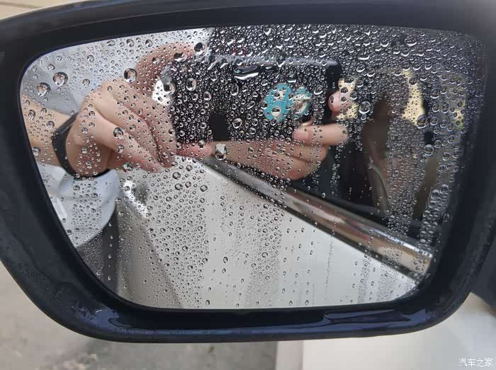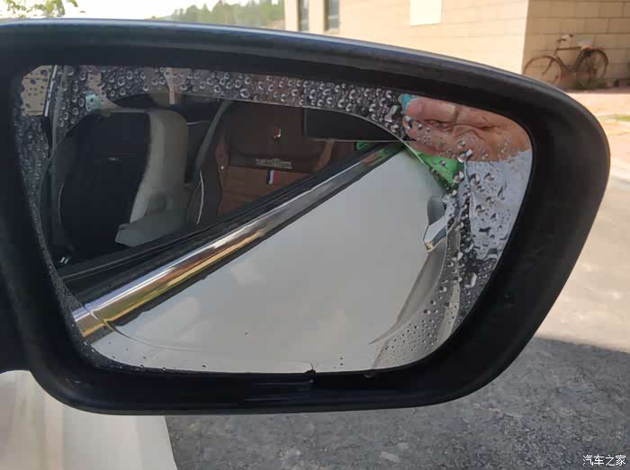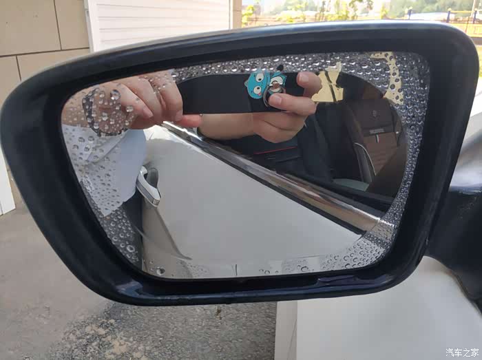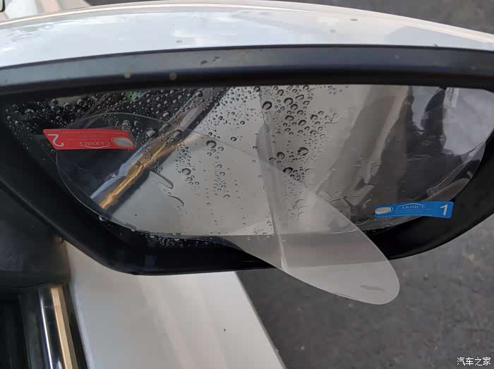 两个倒车镜都粘上之后,我泼了些水,试验一下,的确不沾水,不留有水的痕迹的,东西的效果还是非常明显的。在雨中行驶,侧玻璃上会有水珠,影响到看倒车镜。但是在倒车镜上,有膜的部位,清晰度还是不错的。没有雨水,行车更加安全了。