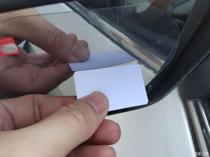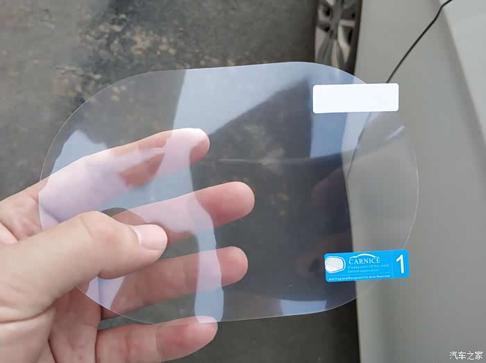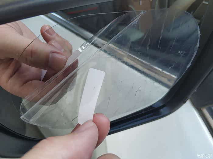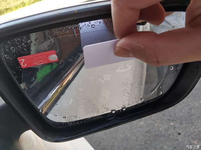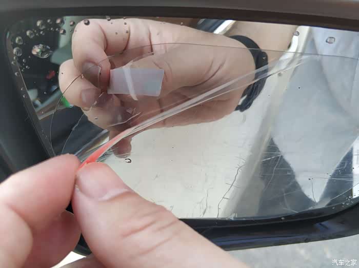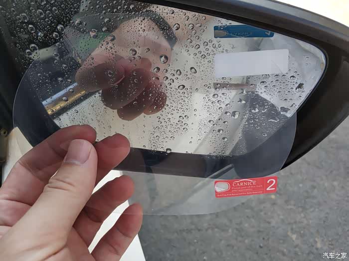 我觉得这个贴就和手机膜一样,虽然不专业,但是我的观点就是贴上不掉就行。这个膜是有两层的,中间的才是真正的防水膜,按照说明我先给倒车镜喷上水,然后揭掉第一张膜,直接粘在上面的。把里面的水刮干净后就直接揭掉第二层膜。如果不揭膜的情况下手感还是比较厚的,揭过之后就发现挺薄的。
