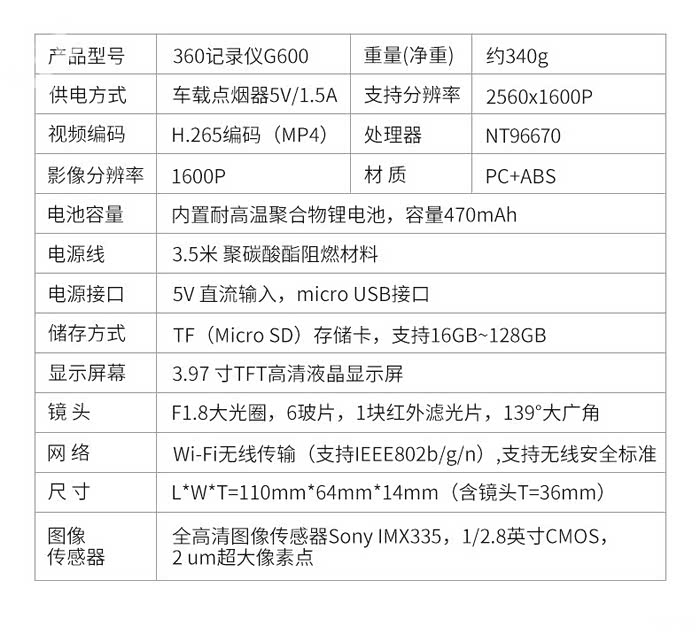 360 G600行车记录仪配置信息。1600P高分辨率,F1.8大光圈,139度大广角。