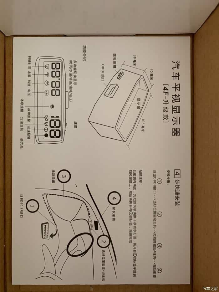 很高兴又一次接到家家众测的产品,是我最想要 ,现在对于我的车子最实用的产品。 那就是卡斯兰hud抬头显示器,我的这款车低配没有水温、时速 瞬时油耗等好多就不一一说啦,但是我最需要的是水温显示其次是时速 ,水温冬天可以方便行车 长时间跑高速可以方便查看及时休息,虽然现在车没那么矫情但是有可以防范一下是吧,时速比指针更准确 更方便。