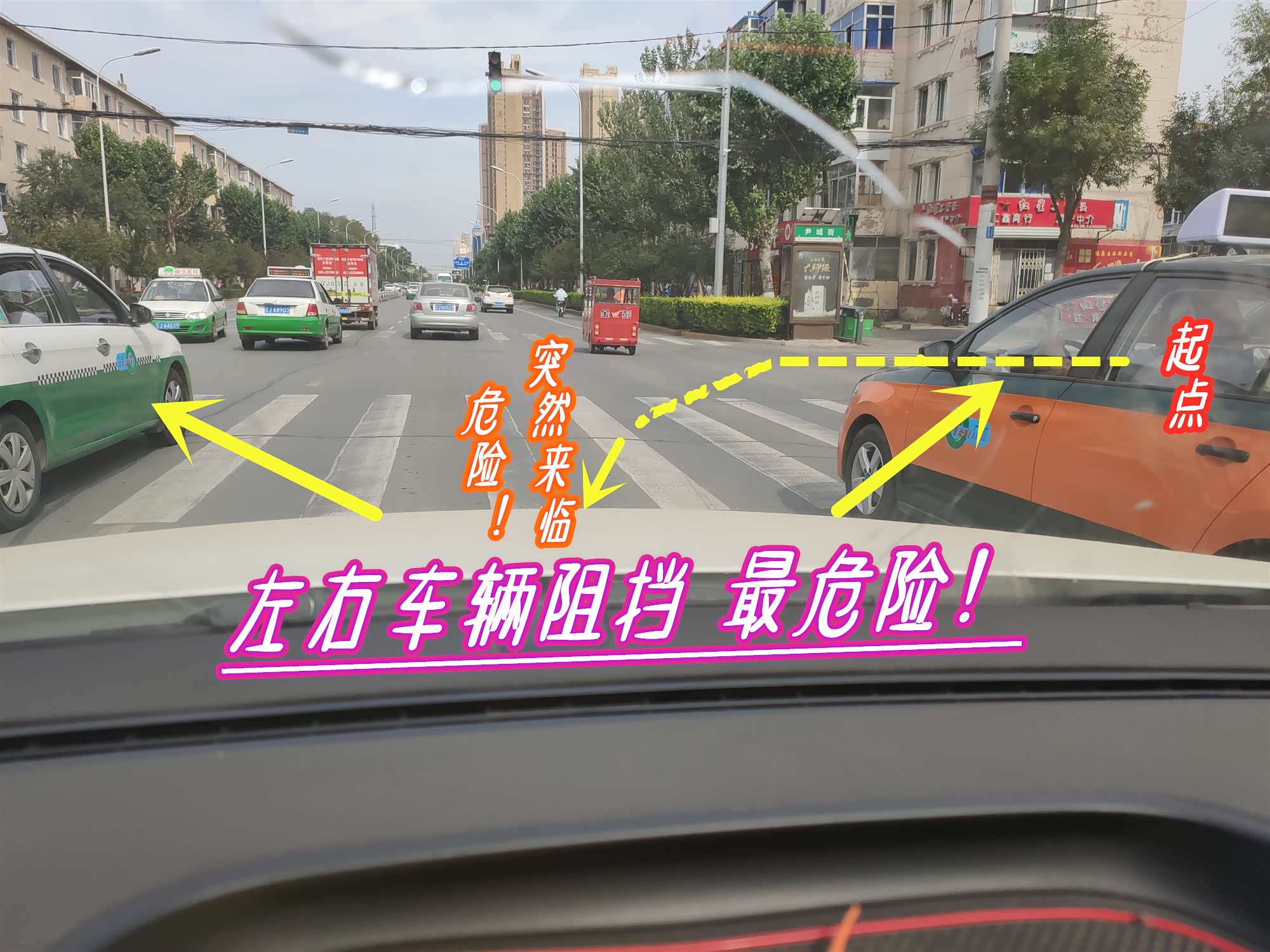 第二种最危险的,也是经常出现碰瓷儿情况的地点,就是这种缓行的红绿灯路口了,因为车辆的众多,左右的视线都会有阻挡,驾驶员无法快速通过,这种情况就是违法碰瓷儿出现的热点,大家一定要注意呦。