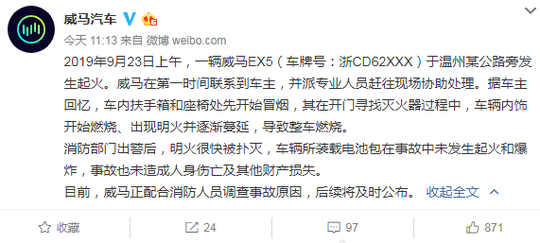 在消防部门出警后,火势得到有效控制,明火很快被扑灭。目前,威马汽车表示,正配合消防人员调查事故原因,后续将及时公布。