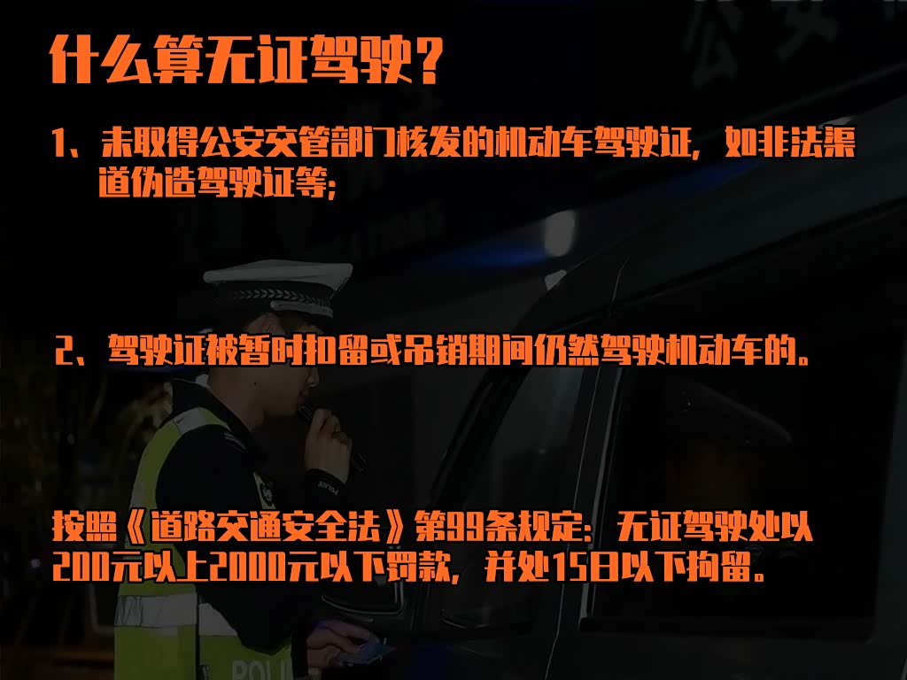 对于无证驾驶来说,国家有着相应的鉴定标准。首先就是你根本没有取得合法的驾照就驾驶车辆,这必然属于无证驾驶。而像驾照被扣满12分以后或者吊销期间驾车,一样会判定是无证驾驶。而且考核力度极大,不仅会罚款+扣分,还会给予15日行政拘留的处罚。