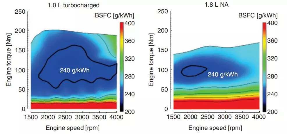 而本田思域的1.0T发动机,热效率并不是其新车销售的宣传卖点,但是在试验中,该发动机在大部分时间内都可以达到35%的热效率,对比之下,两者的差距并不大。这也是为什么各大厂商做小排量增压机的原因。