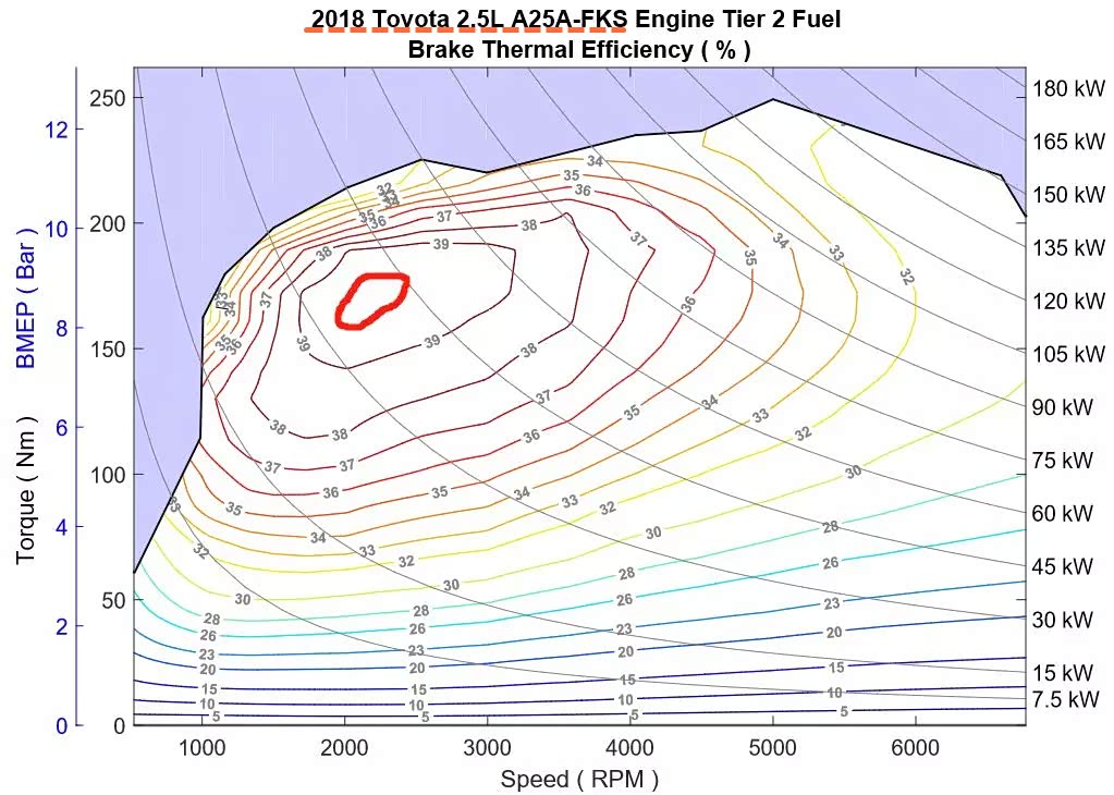 最高热效率它只是在发动机状态最好,转速适中的时候才会出现。可以这么说,最高热效率在用车过程中,只会在很小一部分情况下才会出现。拿凯美瑞2.5L为例,其最高热效率是40%。实际测试中,只有转速在2017rpm,扭矩输出151-172N.m时,才会出现。只要扭矩稍微变化,热效率就会降低到38%。所以这个热效率,对我们实际的购车参考意义不大。
