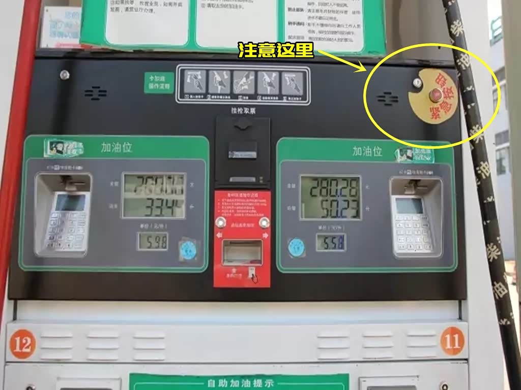 这个按钮一般会设计在加油机的屏幕上方。周围会有“紧急按钮”字样提示。一旦出现火灾,我们瞬间按下按钮,可以瞬间切断加油机电源。虽然无法将起火点熄灭,但至少不会加重火灾。
