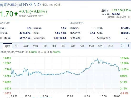 北京时间10月9日,美股开盘时,蔚来股价由前一日收盘价1.55美元上升至1.7美元,随后一度增长16.13%;收盘时,蔚来股价报1.70美元,涨幅为9.68%。然而,在此前的9月23日至10月2日,蔚来股价一度暴跌60.06%,最低跌至1.19美元。