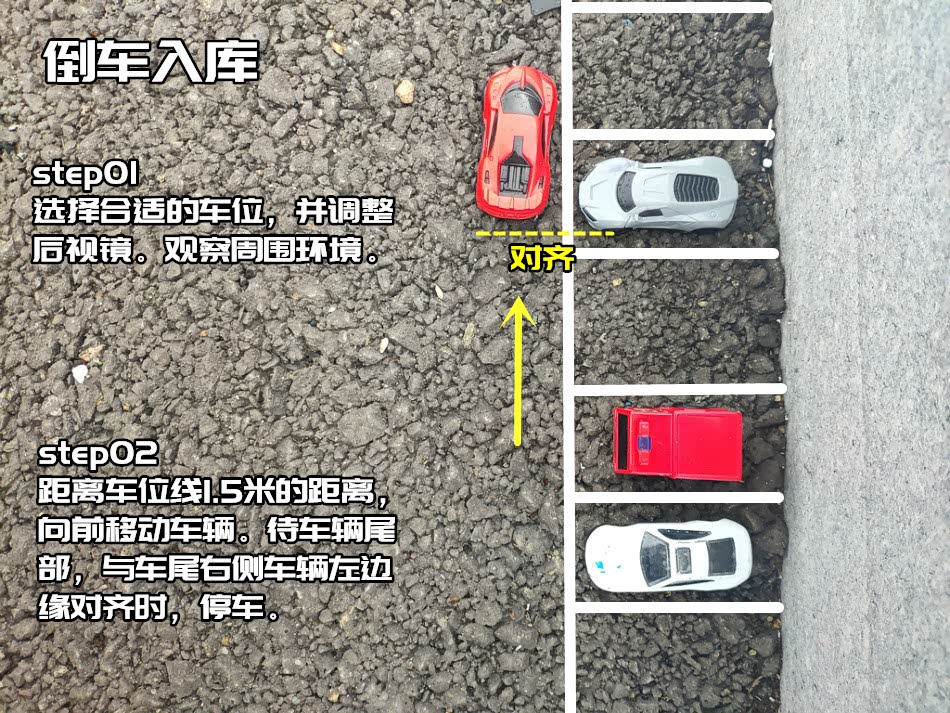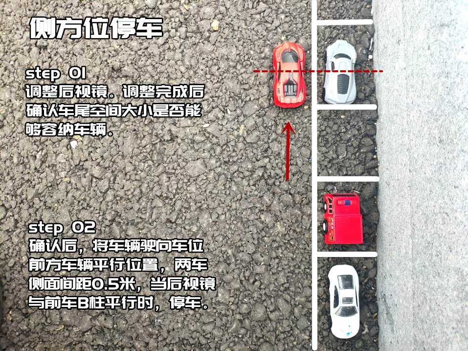 首先我们将车辆开到停车位前方车辆的左侧,距离前车最少0.5米距离。两车保持平行。最简单的就是两车后视镜对准即可。